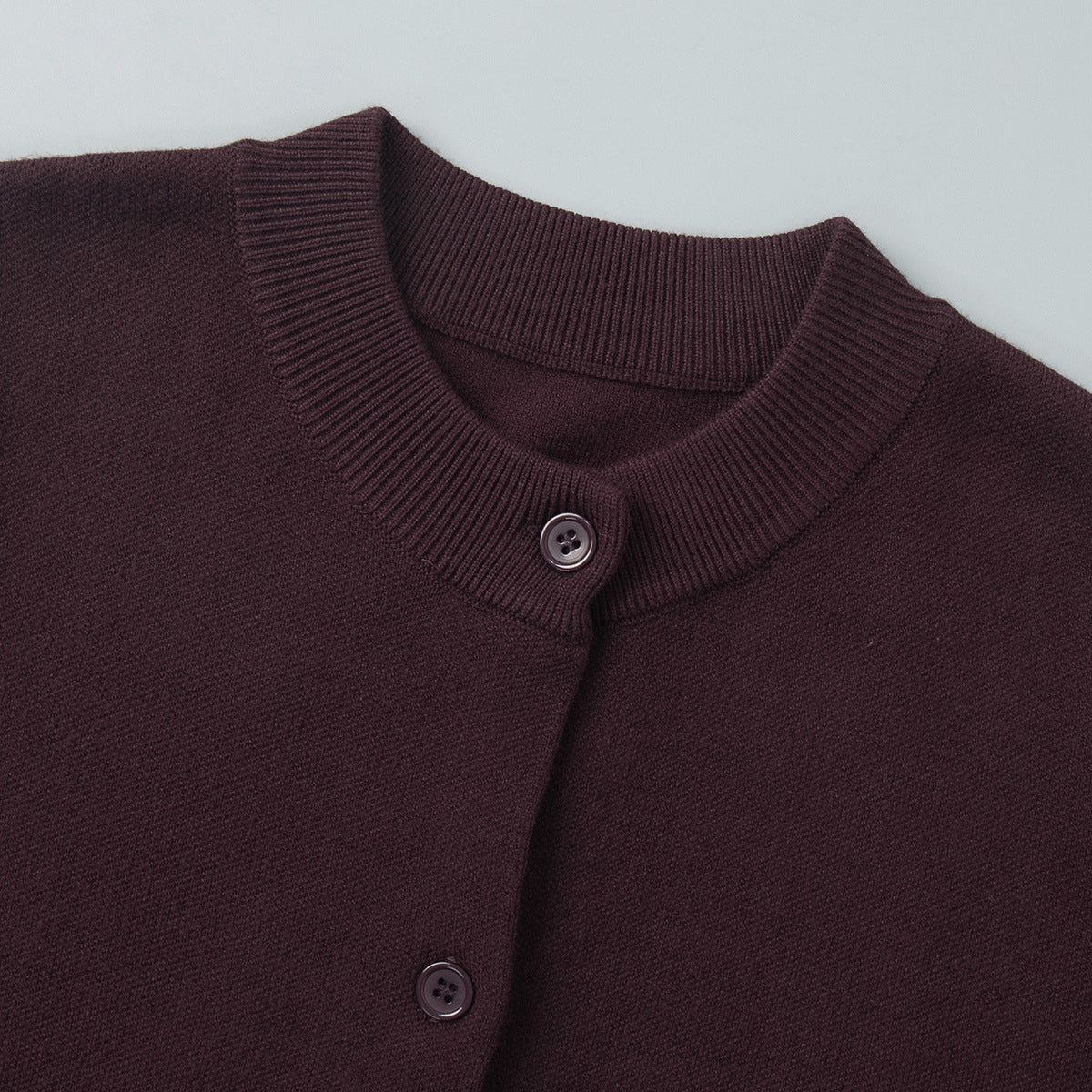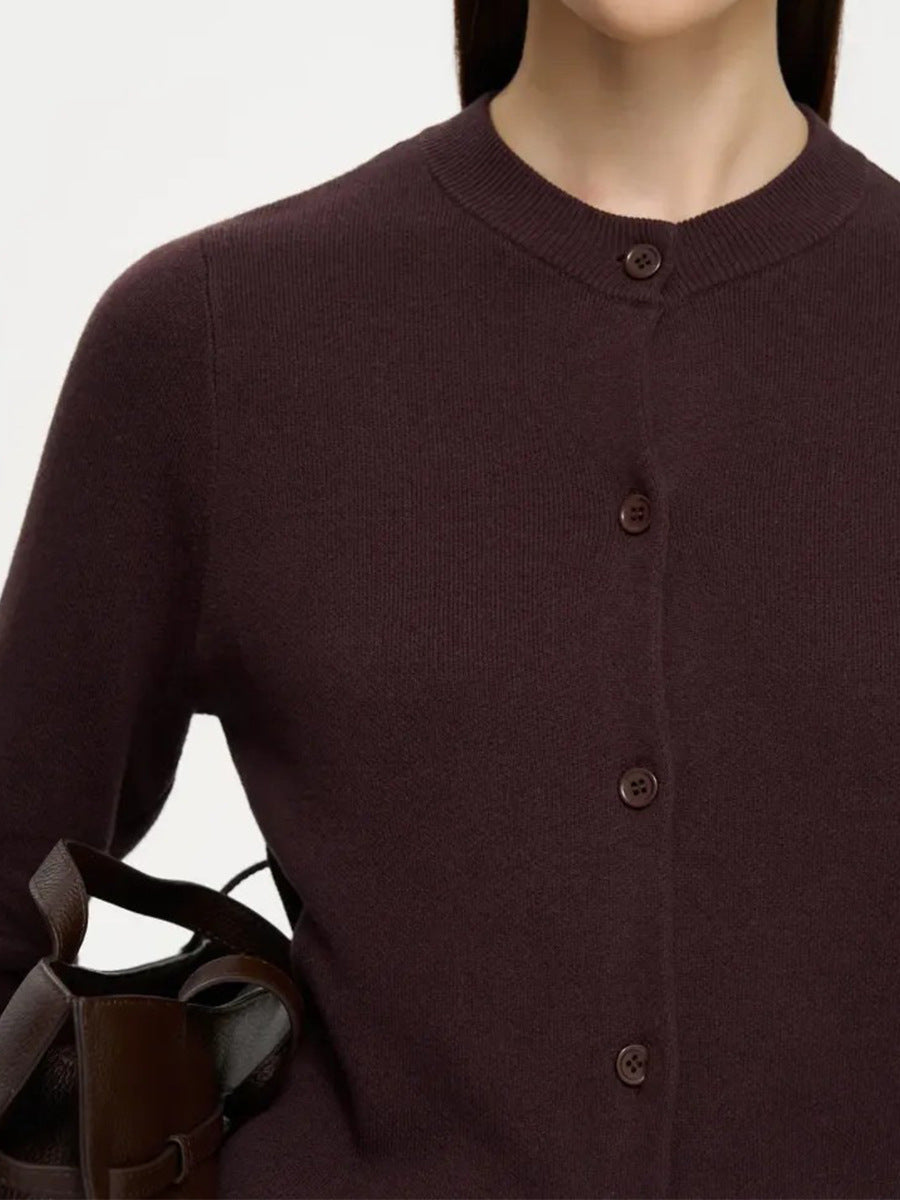 Rib-Trim Cardigan: A classic, button-front cardigan with a round neck and long sleeves. It can be worn buttoned up as a top or open over a layer.